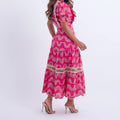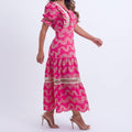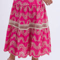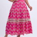 Modelagem: Midi com caimento fluido, ajustado na cintura e com saia ampla em camadas.