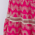 Detalhes: Bordados vazados estilo laise em tom claro, distribuídos em padrões delicados por todo o vestido. Destaque para a aplicação vertical no busto e as faixas horizontais na saia com acabamento em renda, que adicionam sofisticação.