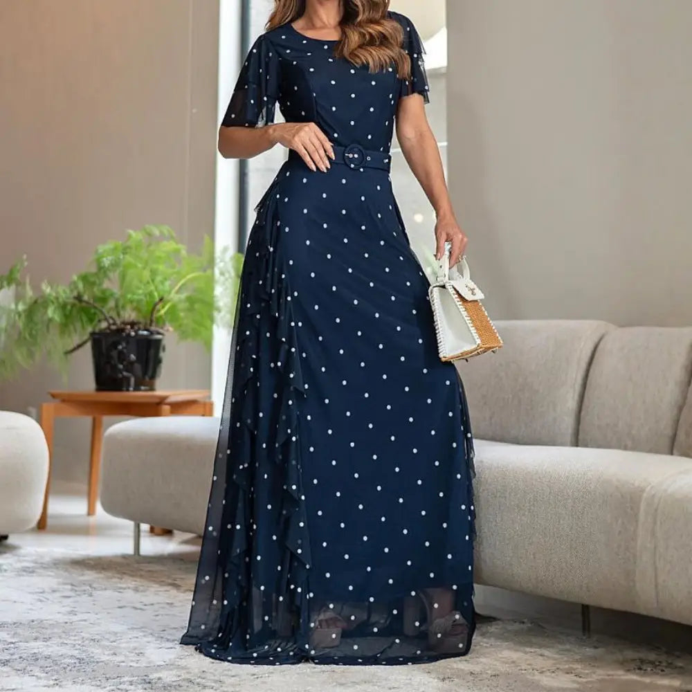 Confeccionado em tule com forro interno, este vestido longo traduz uma feminilidade serena, marcada pelo caimento fluido e pela delicadeza da composição. O decote redondo e as mangas curtas levemente soltas acrescentam suavidade ao visual, enquanto a cintura marcada com cinto do mesmo tecido valoriza a silhueta com naturalidade. A saia longa com babado lateral completa a peça com movimento leve e presença elegante, ideal para ocasiões em que vestir-se com intenção também é uma forma de expressão.