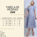 Modelagem: Midi, com caimento levemente estruturado e saia em camadas, proporcionando movimento elegante e delicado.